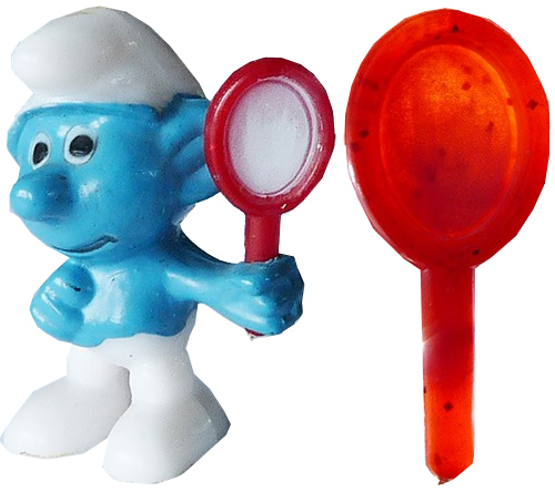 Hier ist die rote lange Flöte das kostbare Sammlerstück. Da der Flötenschlumpf eine gelbe Flöte haben muss, wurde diese rote Flöte gelb bemalt und ist bei dieser Ausführung zum 95 % entfernt. Die Flöte wurde zu dieser Zeit aus rotem Grundmaterial gegossen wie der Spiegel, die Blume und die Blüte.