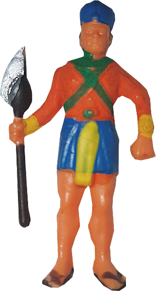Die Figur wird aus mehreren Teilen zusammengesteckt. Besonderheit ist hier noch zusätzlich, dass die Schwertscheide hellbraun bemalt ist.